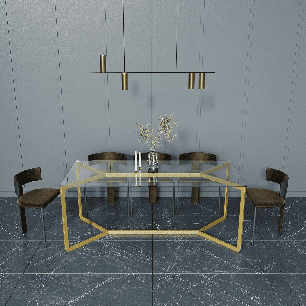 Прямоугольный кухонный стол, состоящий из прозрачного закаленного стекла толщиной 1 см и золотого металлического подстолья, не только прекрасно впишется в интерьер вашего дома, но и станет незаменимым элементом вашего обеденного пространства. Он прекрасно сочетается со стилем LOFT и однозначно будет притягивать взгляды окружающих.