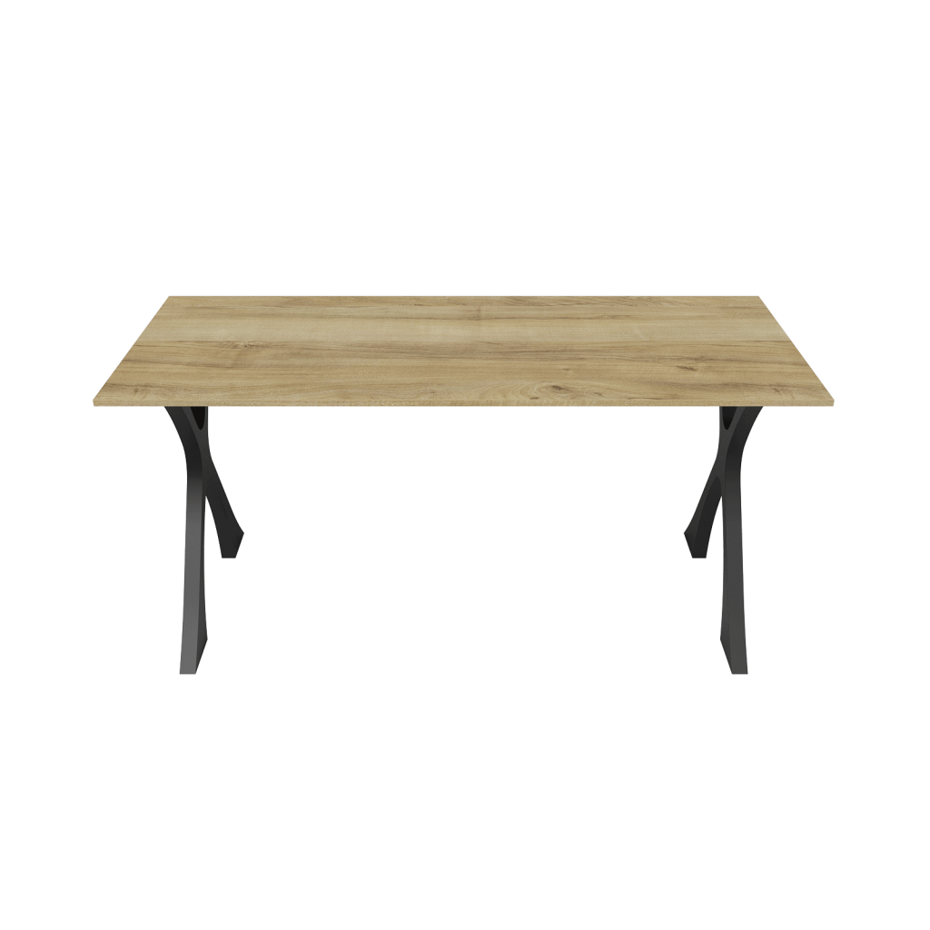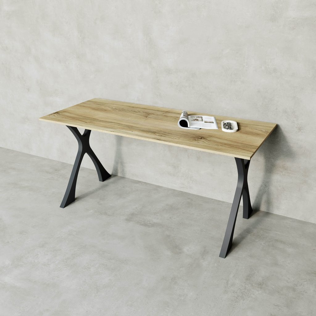 Ключевой элемент дизайна — изящное X-образное подстолье, его строгие прямые линии создают ощущение современности и элегантности. Стандартный вариант – золотое, черное и белое матовое покрытие, придающее столу лаконичный и стильный вид, идеально подходящий для минималистичных и современных интерьеров. Столешница ЛДСП премиального качества цвета орех толщиной 1.6 см, которая гарантирует устойчивость стола к повседневным нагрузкам, а также придает ему солидный и основательный вид.