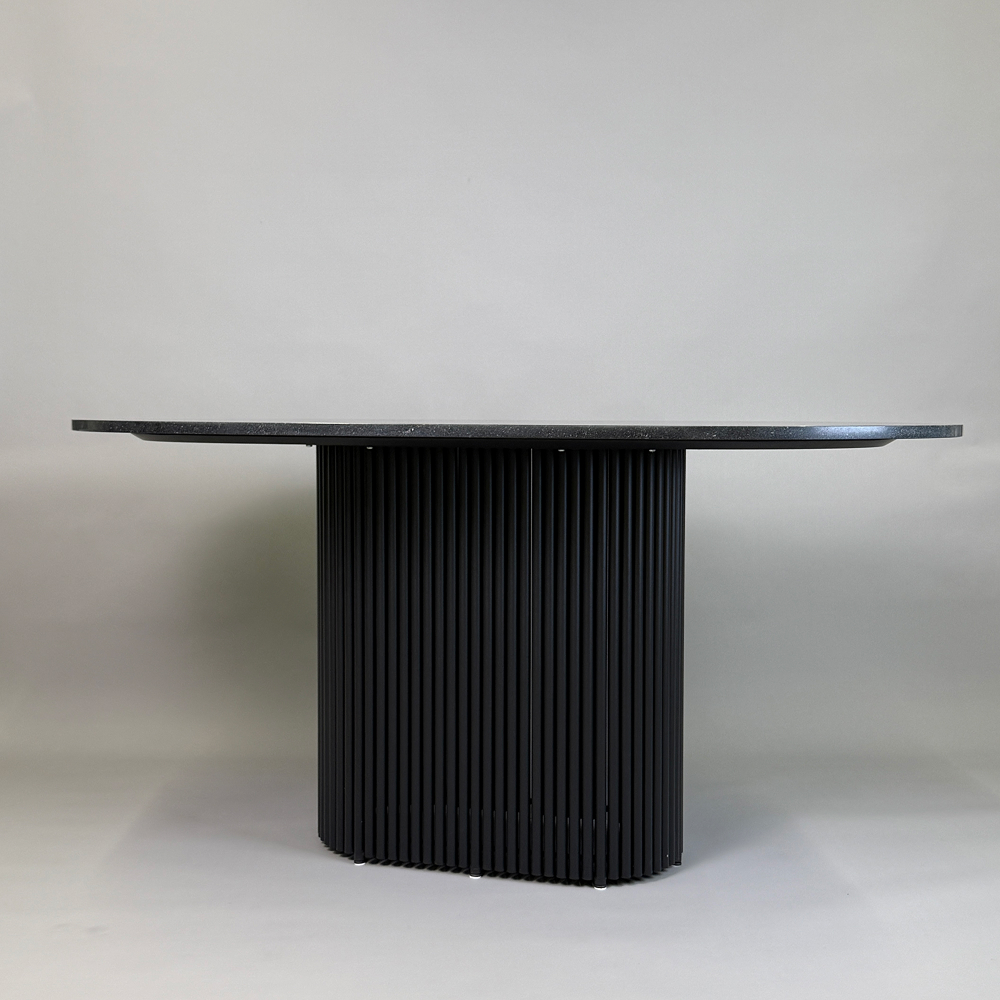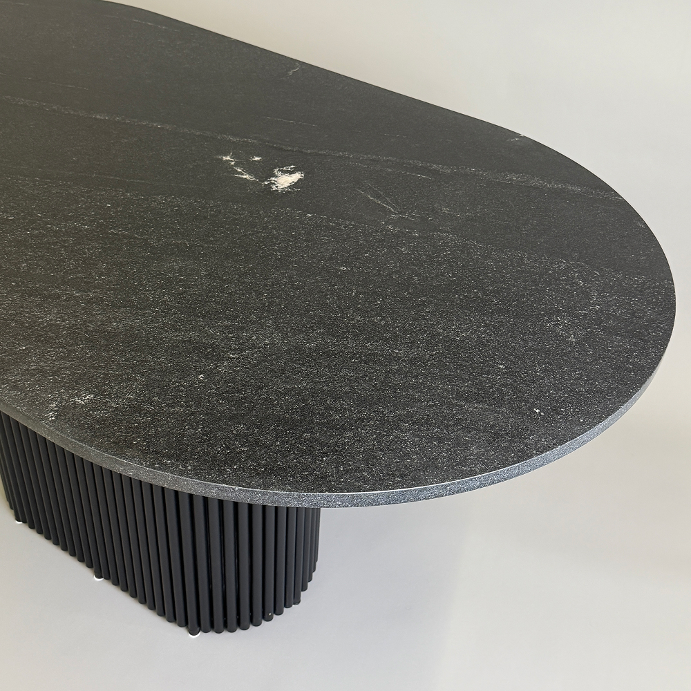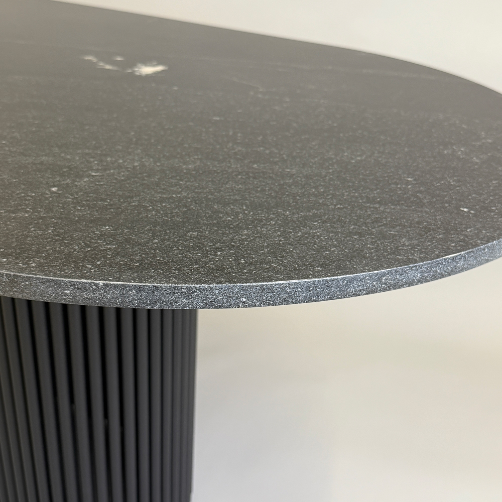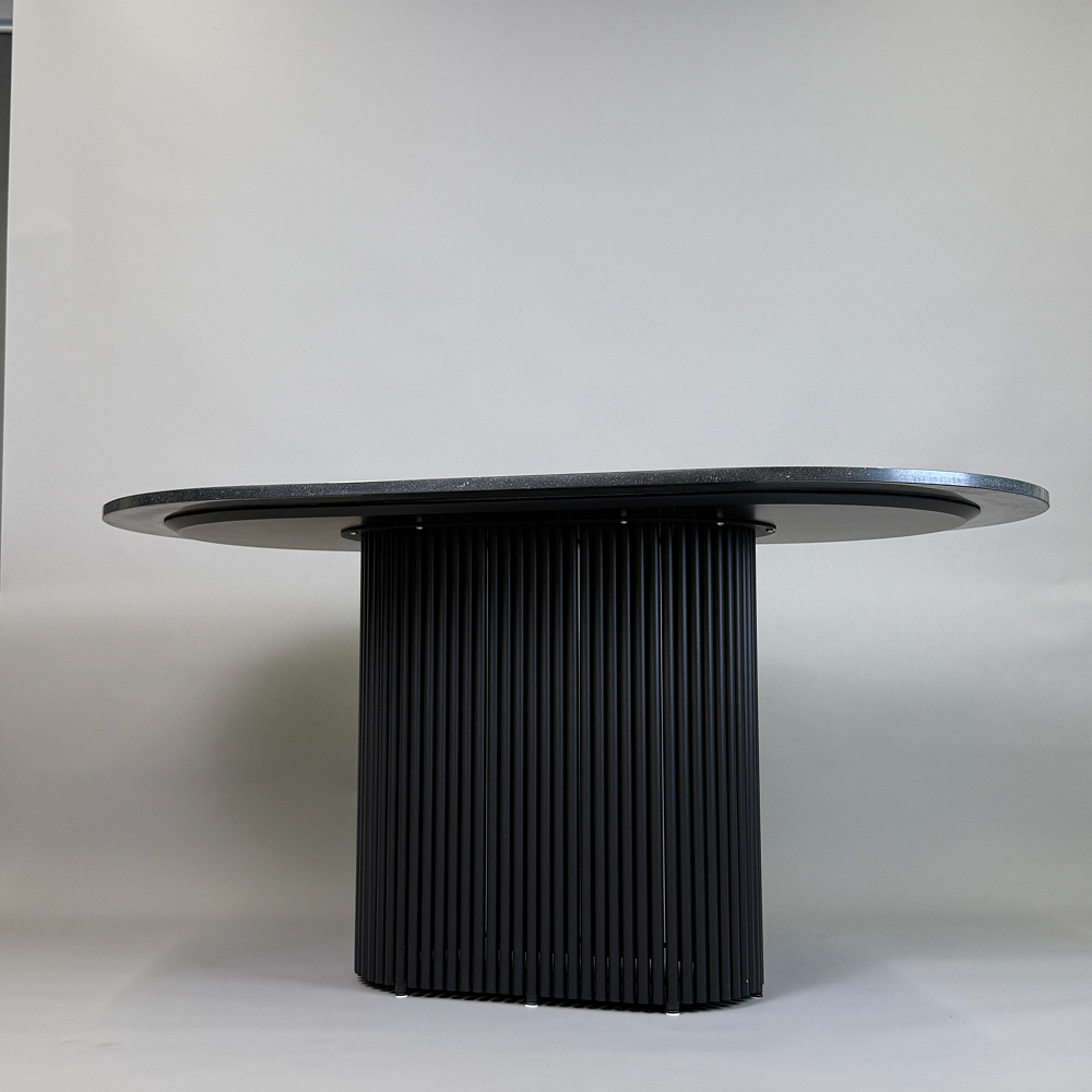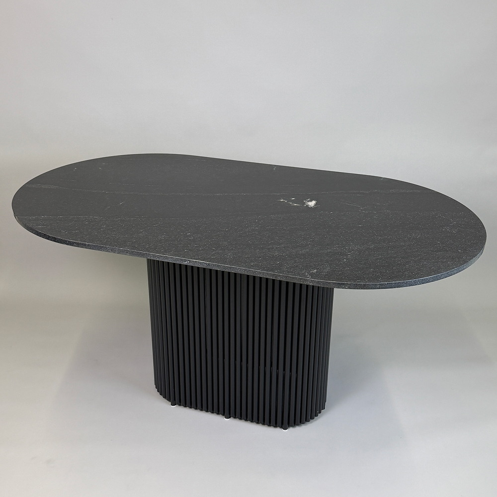 Дизайнерский овальный стол с металлическим трубчатым подстольем чёрного цвета. Обеденный стол — важная часть кухонного интерьера, отлично впишется в минимализм. Овальный стол с рифлёным подстольем станет центральным элементом кухни. Его форма обеспечивает комфорт и удобство для семейных и дружеских встреч. Столешница выполнена из высококачественного МДФ толщиной 1.9 см и гранитом 2 см.
