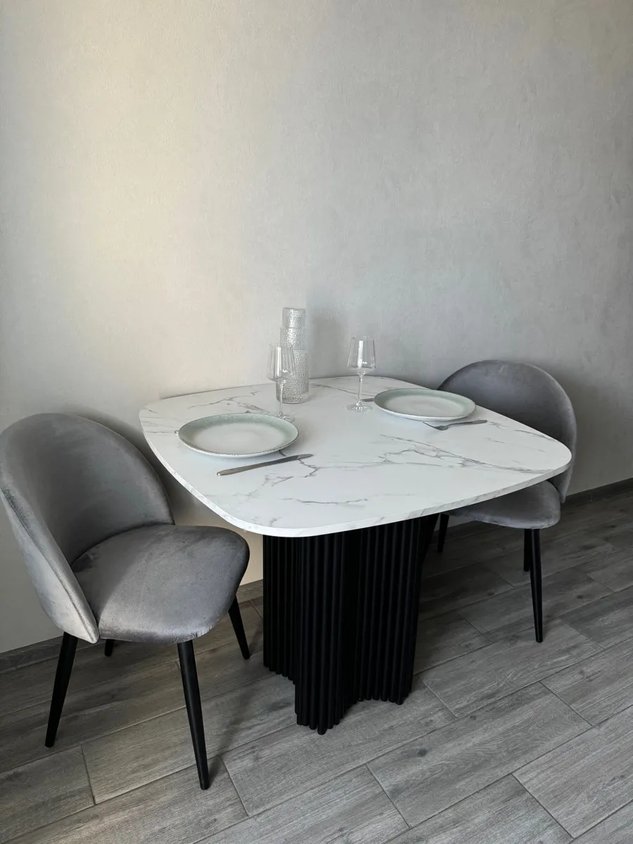 Его конструкция включает в себя столешницу из ЛДСП толщиной 1,6 см с мягко закруглёнными углами для безопасности и комфорта и подстолье, которое выполнено из металлических труб, образующих необычный дизайн в форме клевера, что придает столу современный и элегантный вид. Стол рассчитан на комфортное размещение четырёх человек.