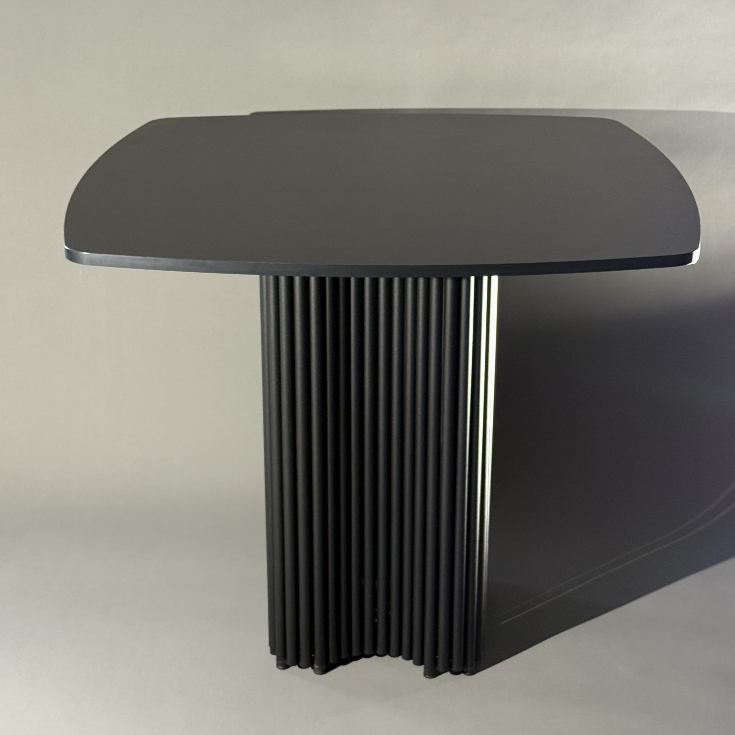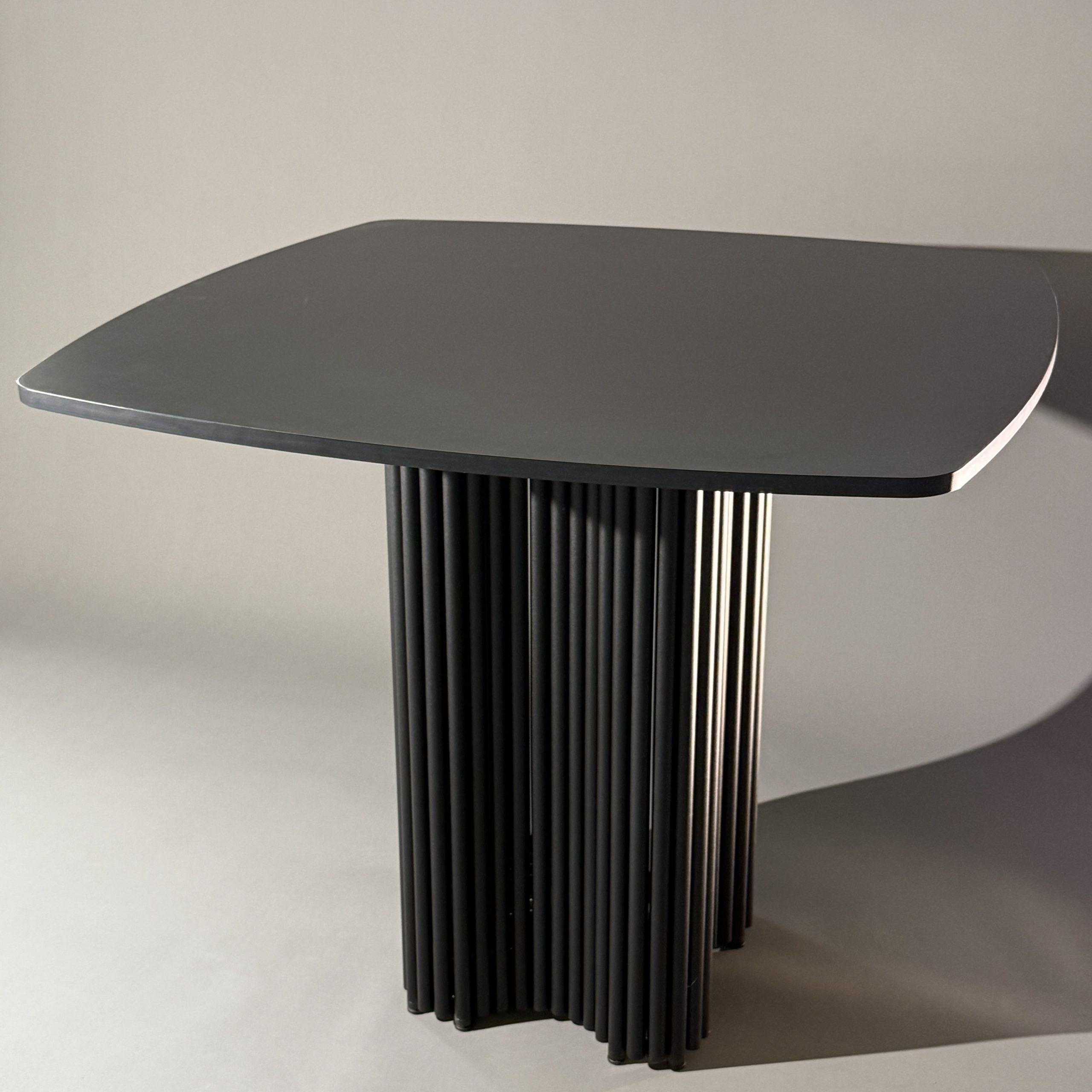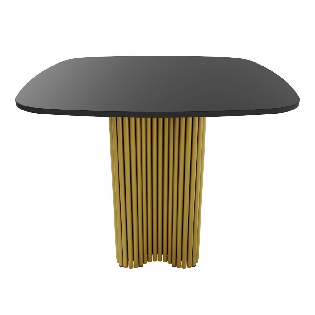 Его конструкция включает в себя столешницу из ЛДСП толщиной 1,6 см с мягко закруглёнными углами для безопасности и комфорта и подстолье, которое выполнено из металлических труб, образующих необычный дизайн в форме клевера, что придает столу современный и элегантный вид. Стол рассчитан на комфортное размещение четырёх человек. В стандартной комплектации предлагается матовая порошковая окраска в трёх цветах: золотом, чёрном и белом.