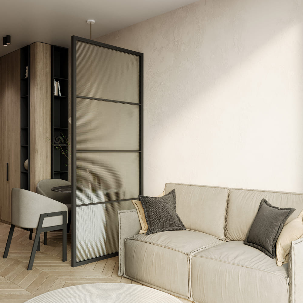 Лофт-перегородки ZONIQUE сочетают стиль, функциональность и элегантность в современном интерьере. Металлический профиль 2×4 см и закалённое стекло 0.4 см обеспечивают прочность и легкость. Декоративная плёнка с имитацией рифления добавляет изюминку внешнему виду пространства. Закалённое стекло гарантирует безопасность, исключая риск травм при ударах. Цветовая гамма включает матовую порошковую окраску в золотом, черном и белом цветах. Уплотнители из ПВХ обеспечивают максимальную герметичность конструкции. Универсальная установка позволяет зонировать помещение, сохраняя ощущение простора.