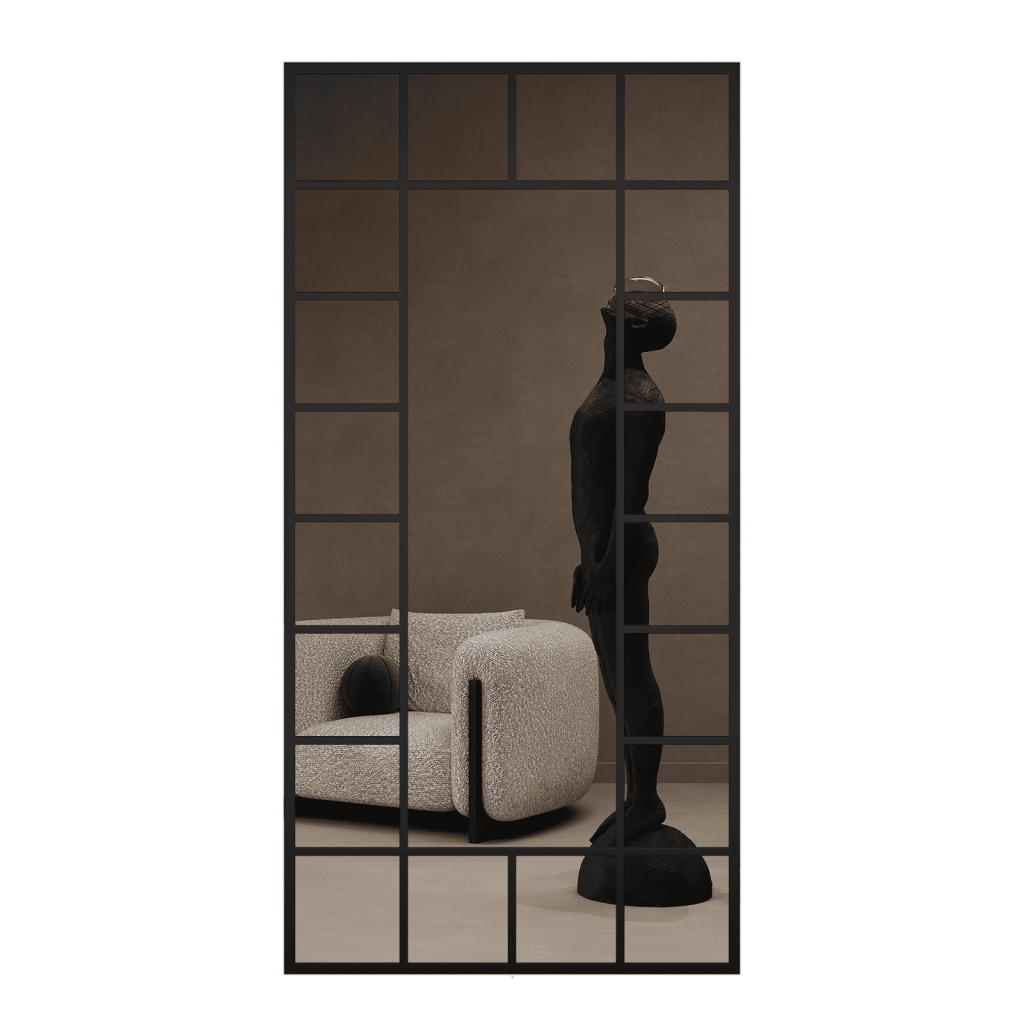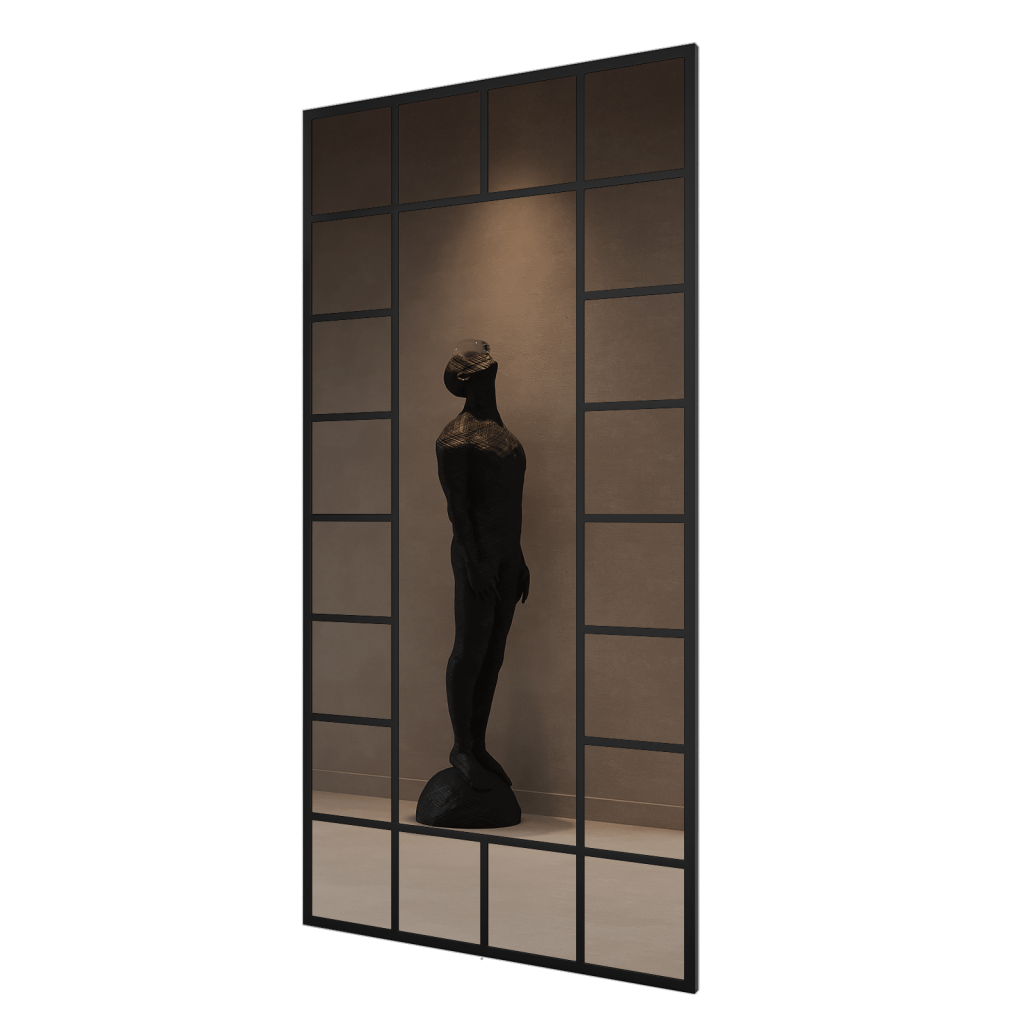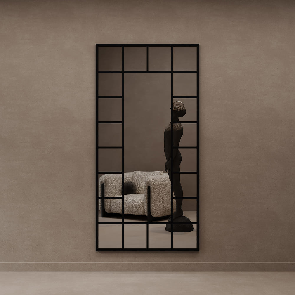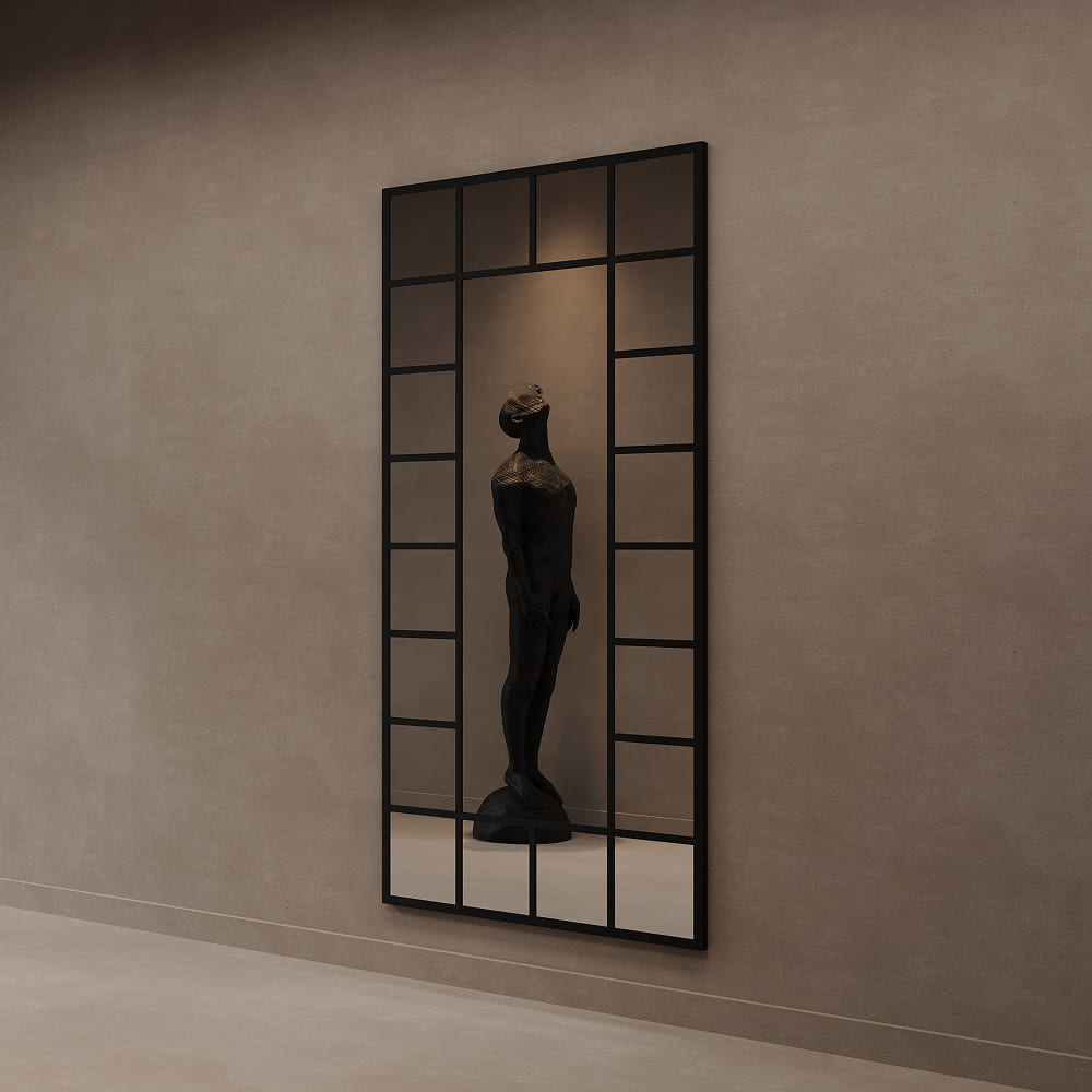 Прочный металлический каркас выполнен из уголка 2,5*2,5 см, а декоративный переплет, создающий эффект окна, — полоса 2*0,4 см. Genglass, известный производитель дизайнерского стекла, позаботился о каждой детали. Зеркальное полотно надежно фиксируется с помощью специального уплотнителя, исключая возможность его смещения или повреждения, а удобные подвесы на задней стороне рамы значительно упрощают процесс настенного монтажа. Его можно закрепить на стене или просто поставить на пол, прислонив к стене под углом для создания динамичного акцента.