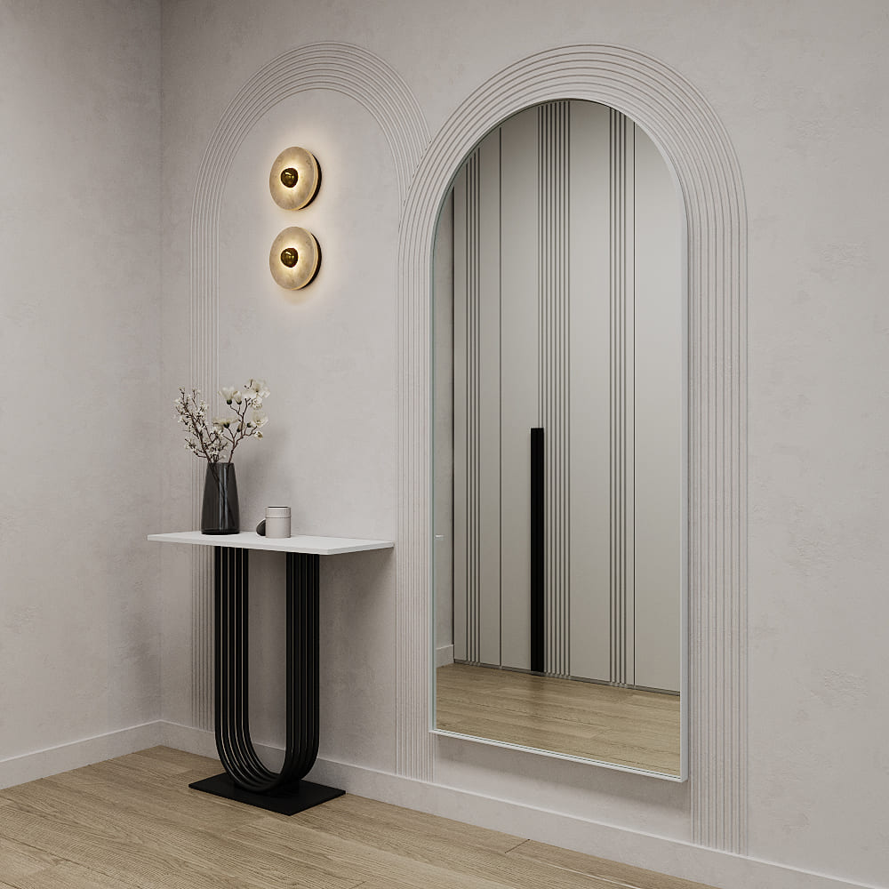 Это зеркало в форме арки предлагает возможность добавления подсветки или изменения размеров и цвета на заказ, чтобы полностью соответствовать вашим предпочтениям и требованиям. На тыльной стороне рамы имеются крепежные элементы для удобной настенной установки, и комплектация включает саморезы.