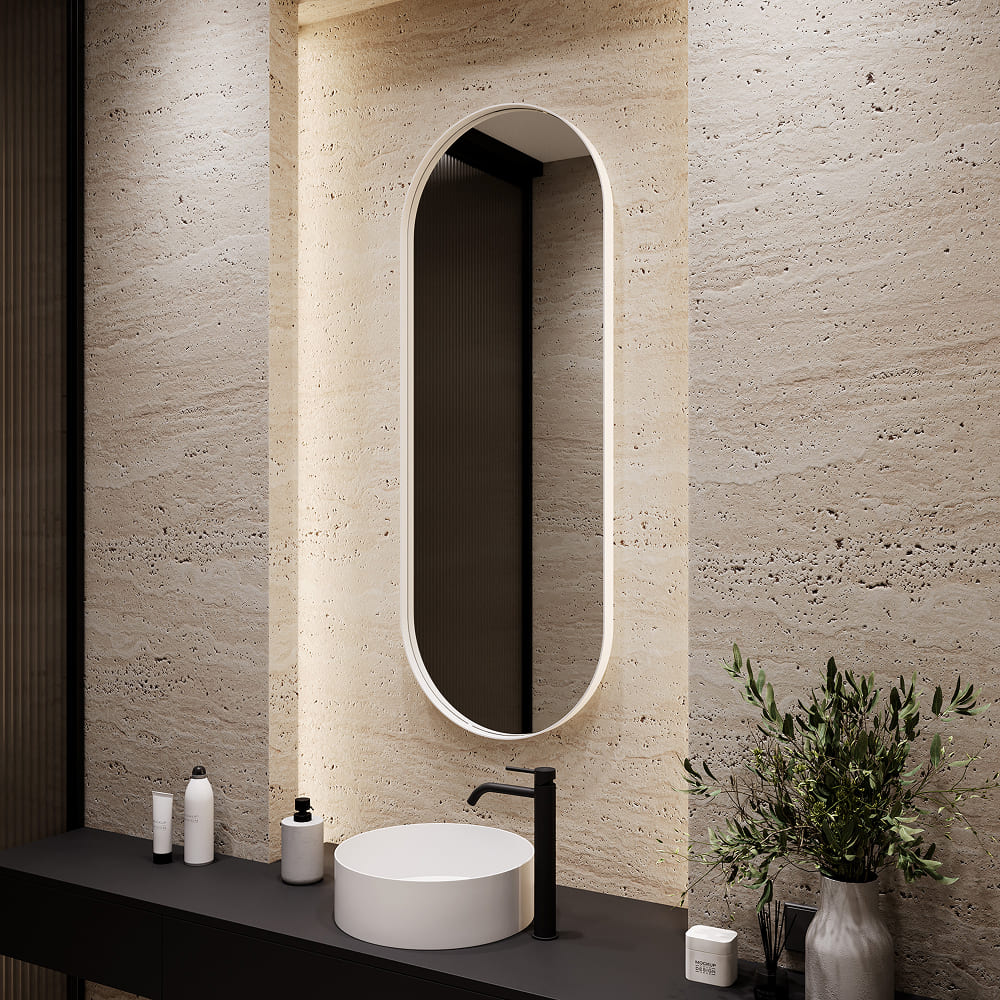 Вы также можете заказать дополнительные опции, такие как подсветка или изменение размера и цвета зеркала капсульной формы, чтобы создать индивидуальное изделие, соответствующее вашим предпочтениям. На тыльной стороне рамы присутствуют крепежные элементы, а саморезы входят в комплект поставки, обеспечивая удобство и простоту установки.