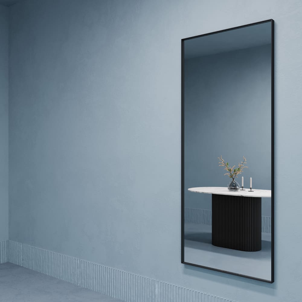 Большое прямоугольное зеркало HALFEO в тонкой металлической раме ручной работы. Зеркало в полный рост может быть как настенным, так и напольным. Производится как стандартно в тонкой раме 0.4*4 см с выступом рамы 1.5 см, так и в толстой раме 2*2 см. На тыльной стороне рамы присутствуют отверстия для монтажа на стену. Также зеркало можно просто облокотить об стену и поставить его под удобным углом наклона.