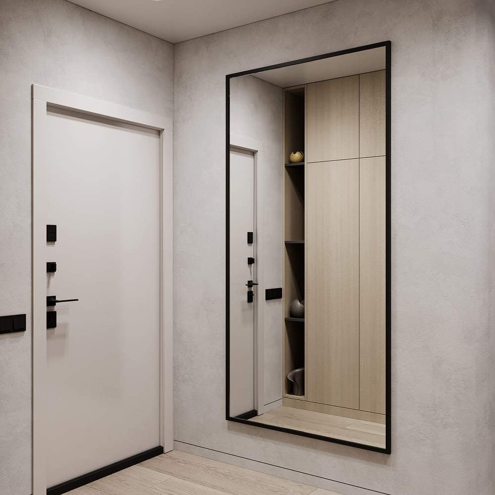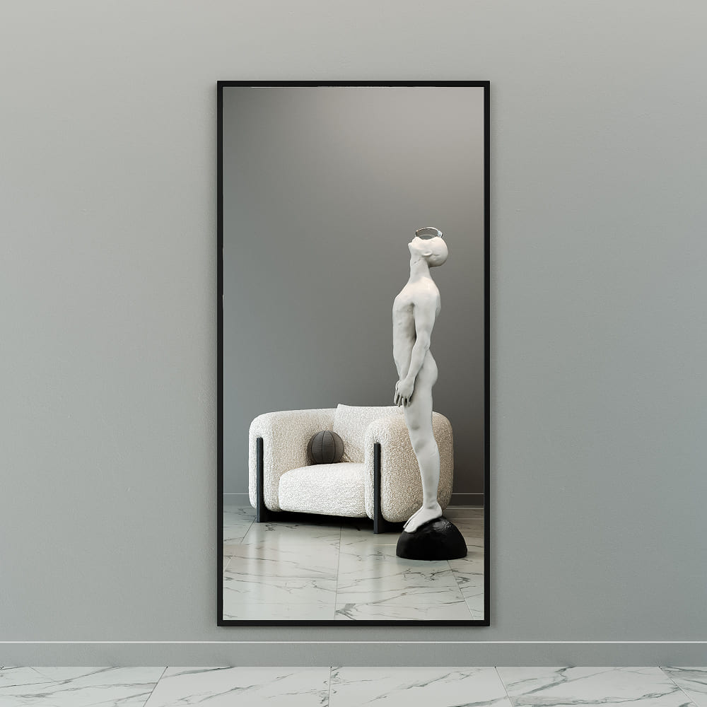 Большое прямоугольное зеркало HALFEO в тонкой металлической раме ручной работы. Зеркало в полный рост может быть как настенным, так и напольным. Производится как стандартно в тонкой раме 0.4*4 см с выступом рамы 1.5 см, так и в толстой раме 2*2 см. На тыльной стороне рамы присутствуют отверстия для монтажа на стену. Также зеркало можно просто облокотить об стену и поставить его под удобным углом наклона.