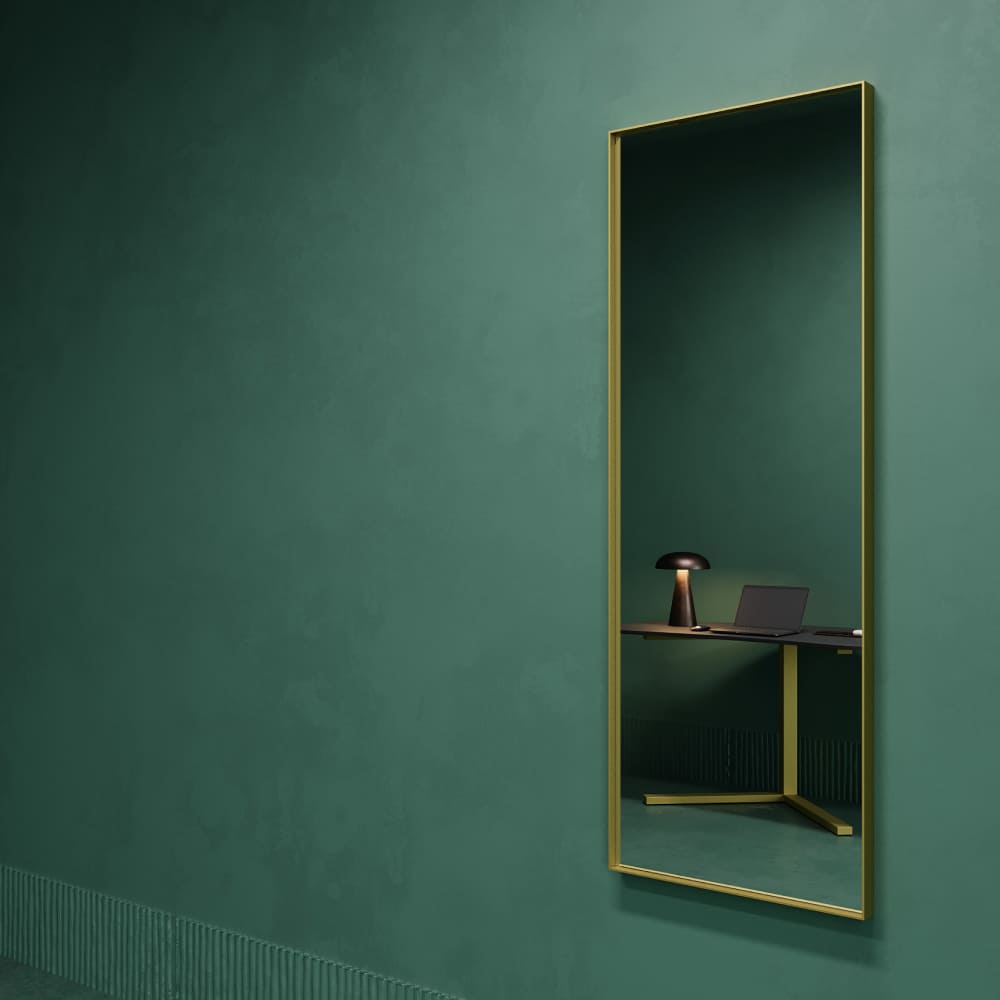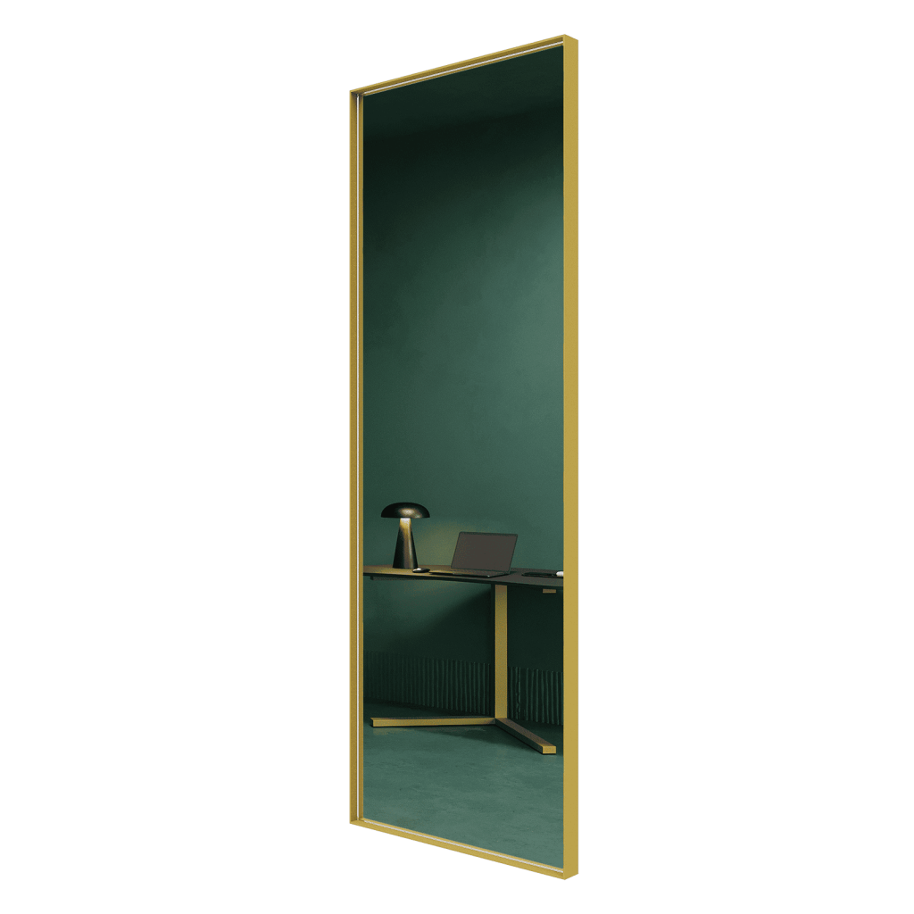 Большое прямоугольное зеркало HALFEO в тонкой металлической раме ручной работы. Зеркало в полный рост может быть как настенным, так и напольным. Производится как стандартно в тонкой раме 0.4*4 см с выступом рамы 1.5 см, так и в толстой раме 2*2 см. На тыльной стороне рамы присутствуют отверстия для монтажа на стену. Также зеркало можно просто облокотить об стену и поставить его под удобным углом наклона.