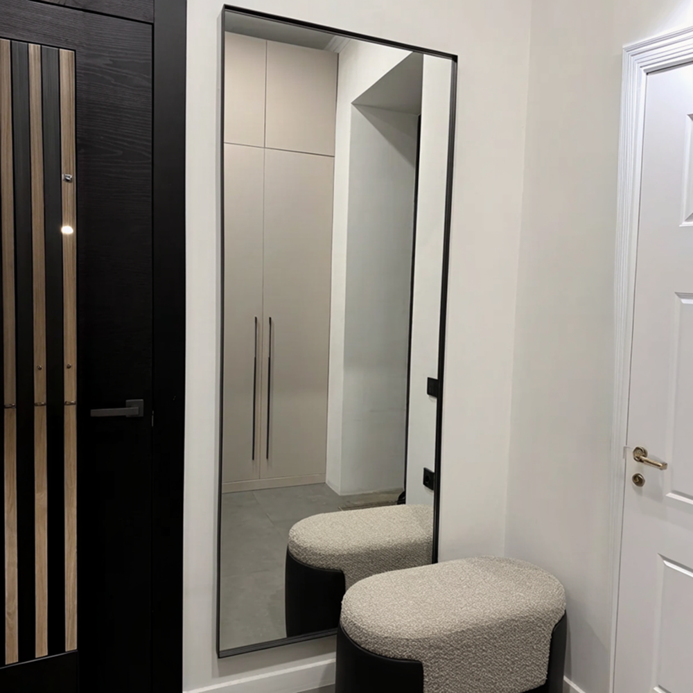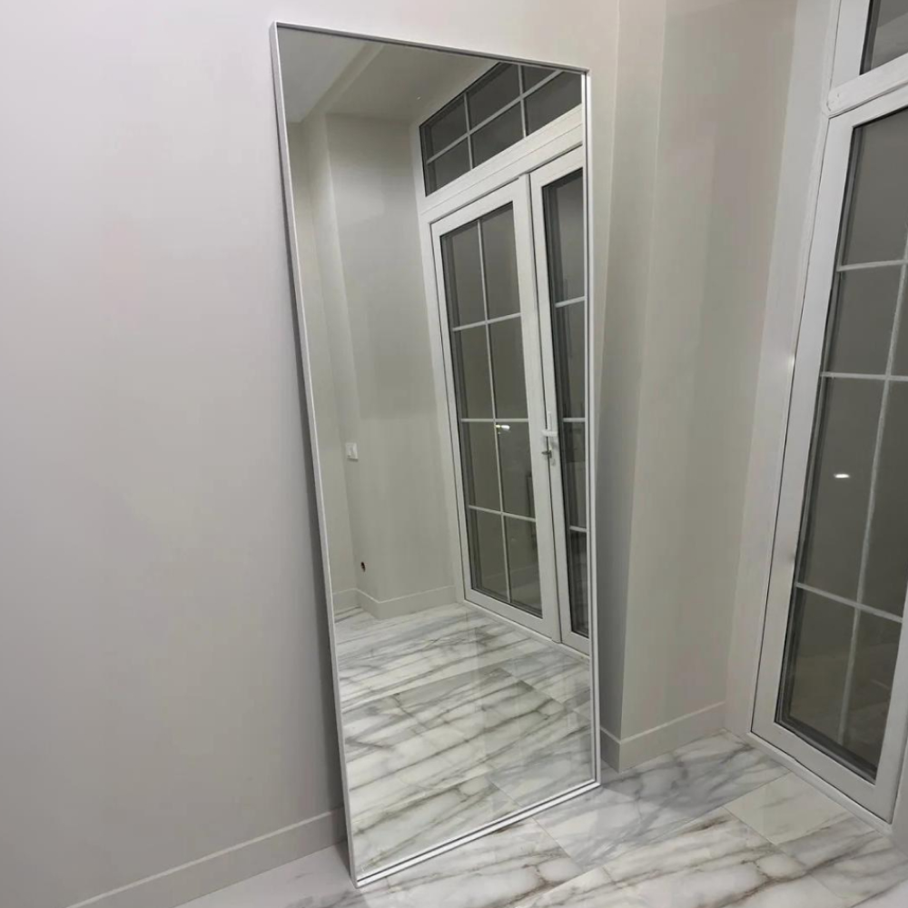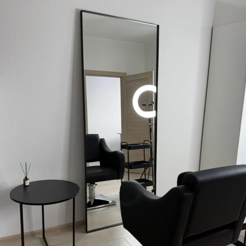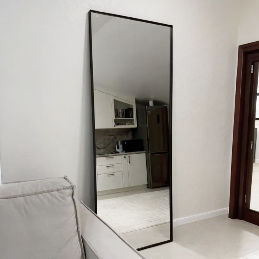 Большое прямоугольное зеркало HALFEO в тонкой металлической раме ручной работы. Зеркало в полный рост может быть как настенным, так и напольным. Производится как стандартно в тонкой раме 0.4*4 см с выступом рамы 1.5 см, так и в толстой раме 2*2 см. На тыльной стороне рамы присутствуют отверстия для монтажа на стену. Также зеркало можно просто облокотить об стену и поставить его под удобным углом наклона.