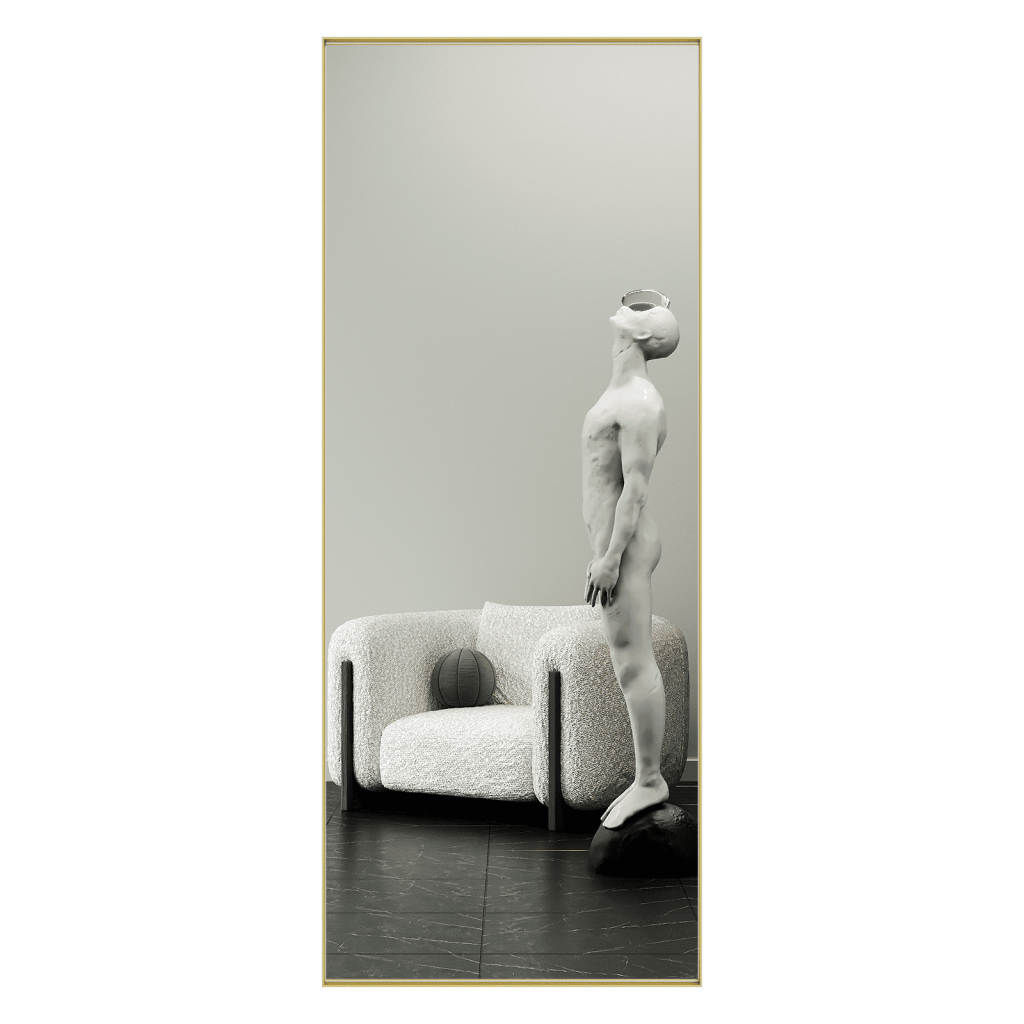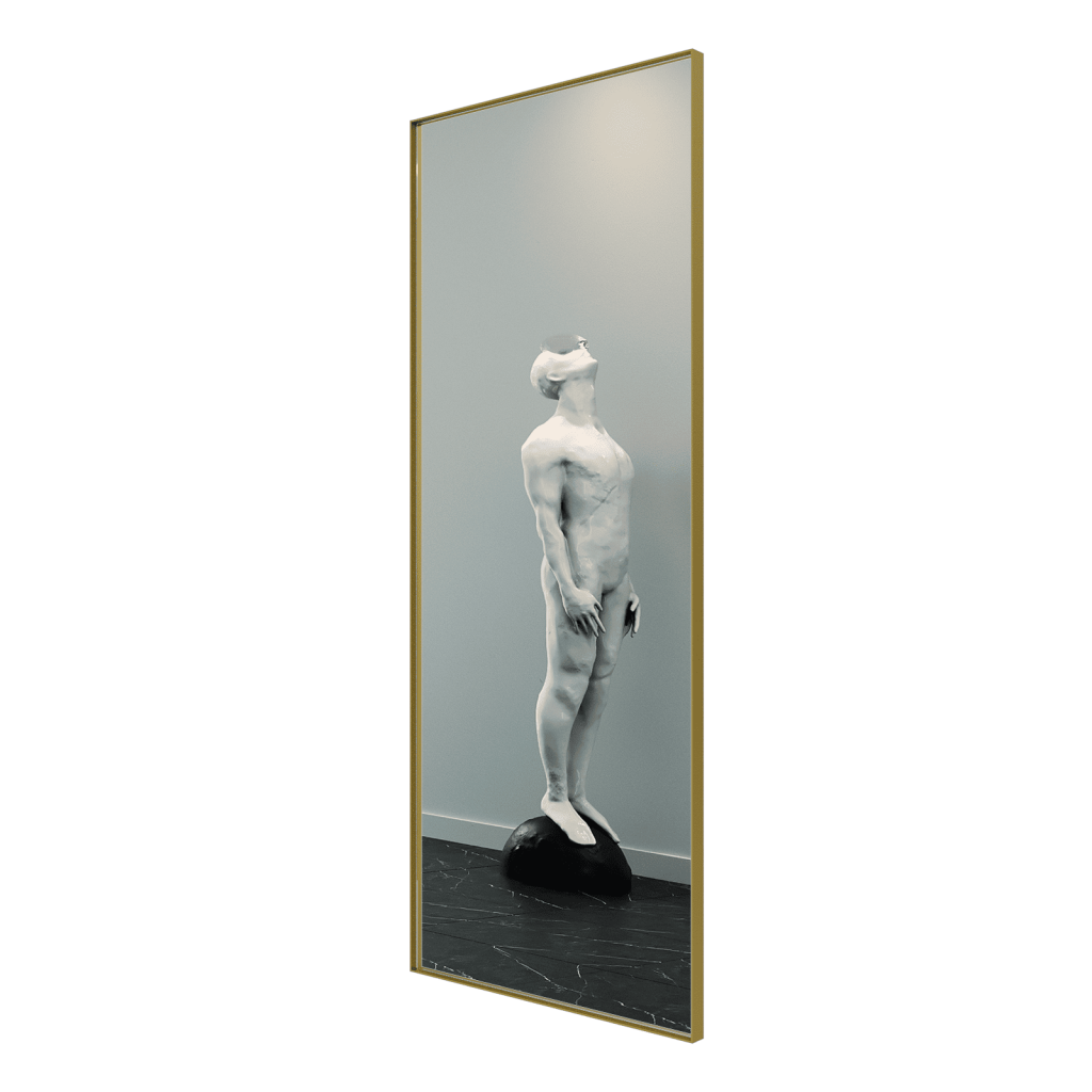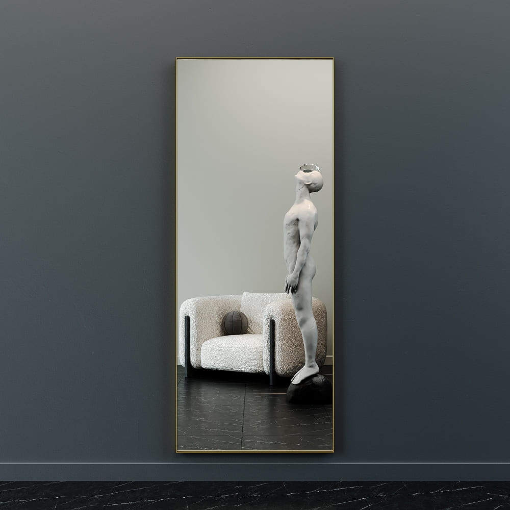 Большое прямоугольное зеркало HALFEO в тонкой металлической раме ручной работы. Зеркало в полный рост может быть как настенным, так и напольным. Производится как стандартно в тонкой раме 0.4*4 см с выступом рамы 1.5 см, так и в толстой раме 2*2 см. На тыльной стороне рамы присутствуют отверстия для монтажа на стену. Также зеркало можно просто облокотить об стену и поставить его под удобным углом наклона.