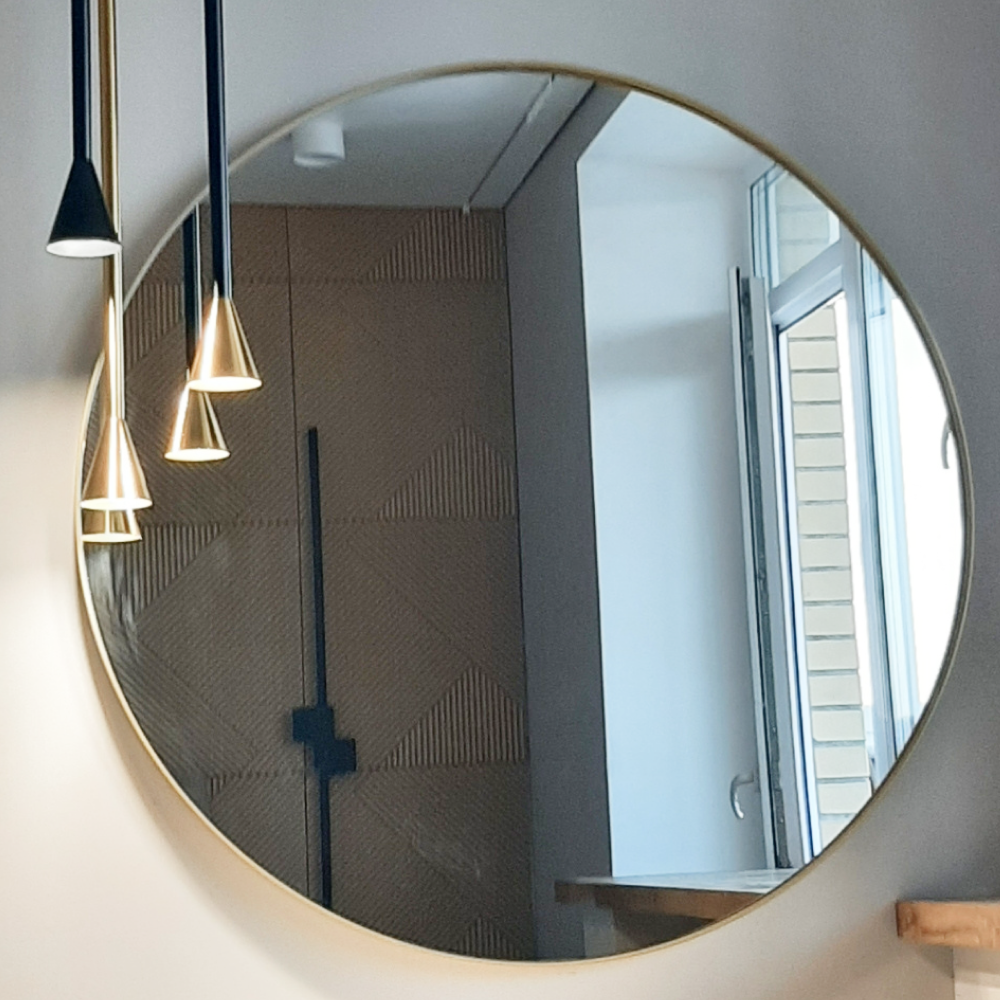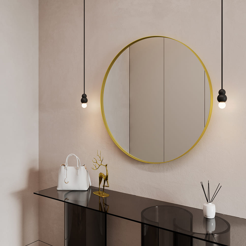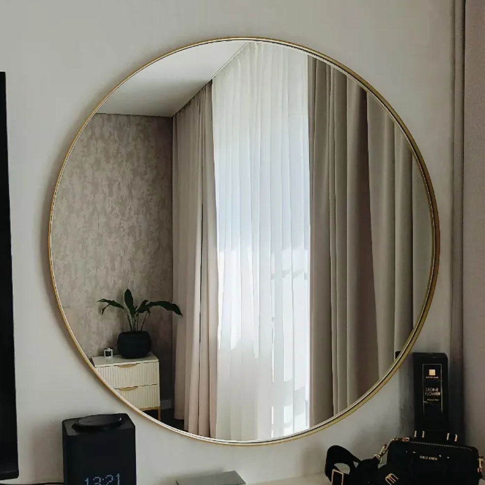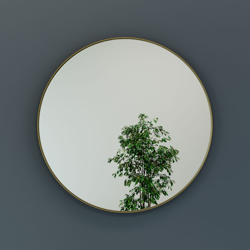 Круглое зеркало RAUNTEL L в тонкой металлической раме ручной работы – изящное и стильное решение для вашего интерьера. Рама имеет элегантный выступ 1,5 см перед зеркалом, создавая привлекательный эффект углубления. Габаритный диаметр зеркала составляет 101 см.