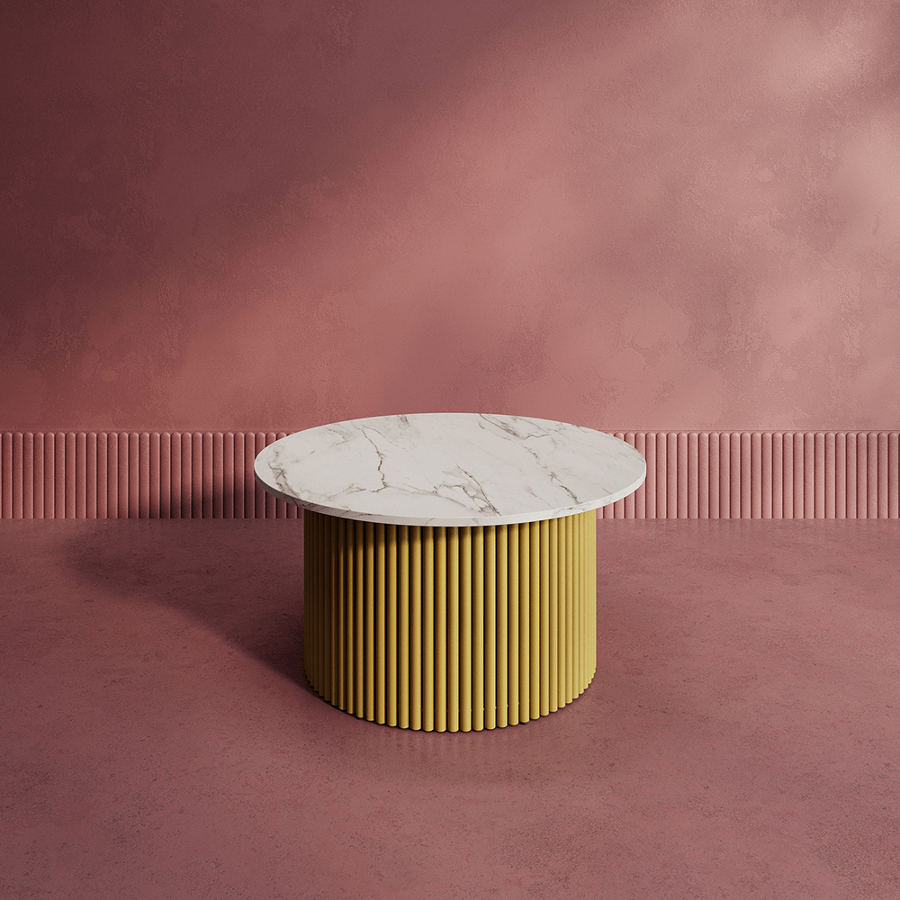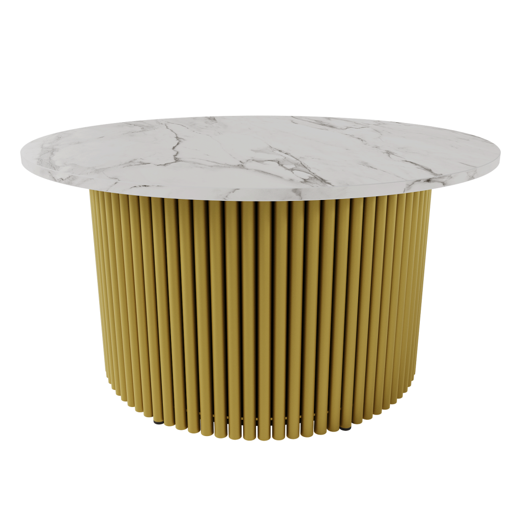 Дизайнерский круглый стол с трубчатым подстольем. Столешница ЛДСП цвета белый мрамор толщиной 1.6 см. Стандартный вариант металлического подстолья — матовая порошковая окраска в золотой, чёрный или белый цвет. Круглый журнальный дизайнерский стол с рифлёным подстольем — это удивительно практичное и стильное дополнение для любого интерьера. Существует множество вариантов использования дизайнерского стола. Cтол идеален для гостиной как кофейный стол, косметический стол для размещения журналов, газет, книг и других предметов. Cтол станет украшением вашего пространства и будет вызывать только положительные эмоции у ваших гостей. Стол выполнен из высококачественных материалов, которые гарантируют его долговечность и надежность. В комплекте имеются регулируемые ножки для устойчивости стола на неровных поверхностях.